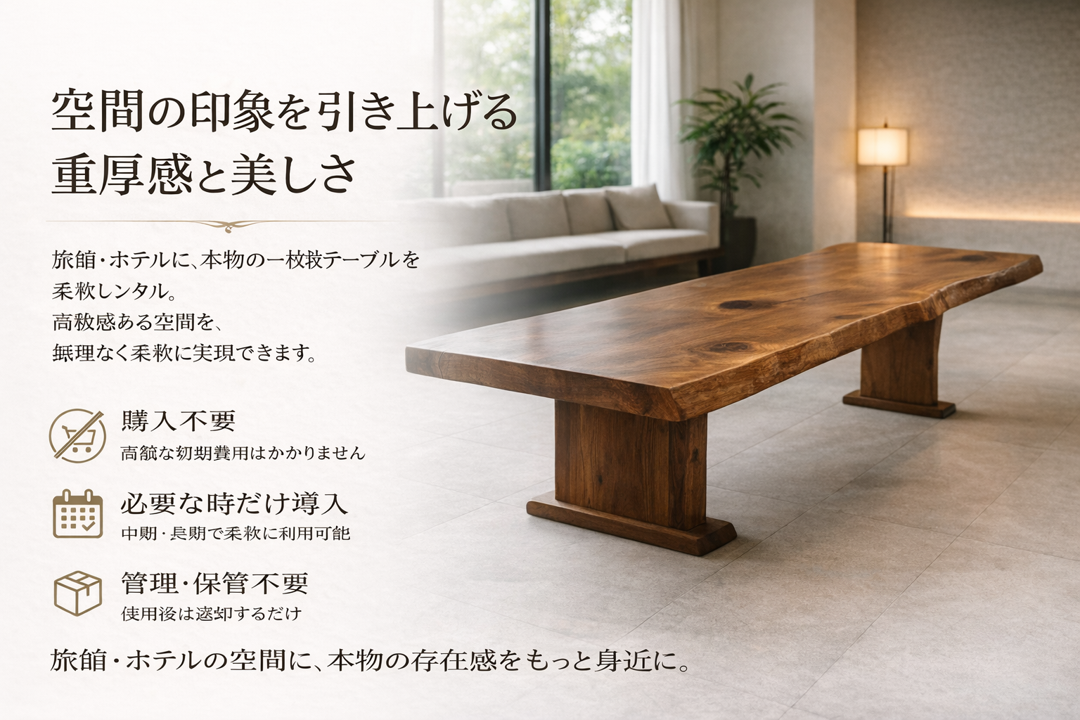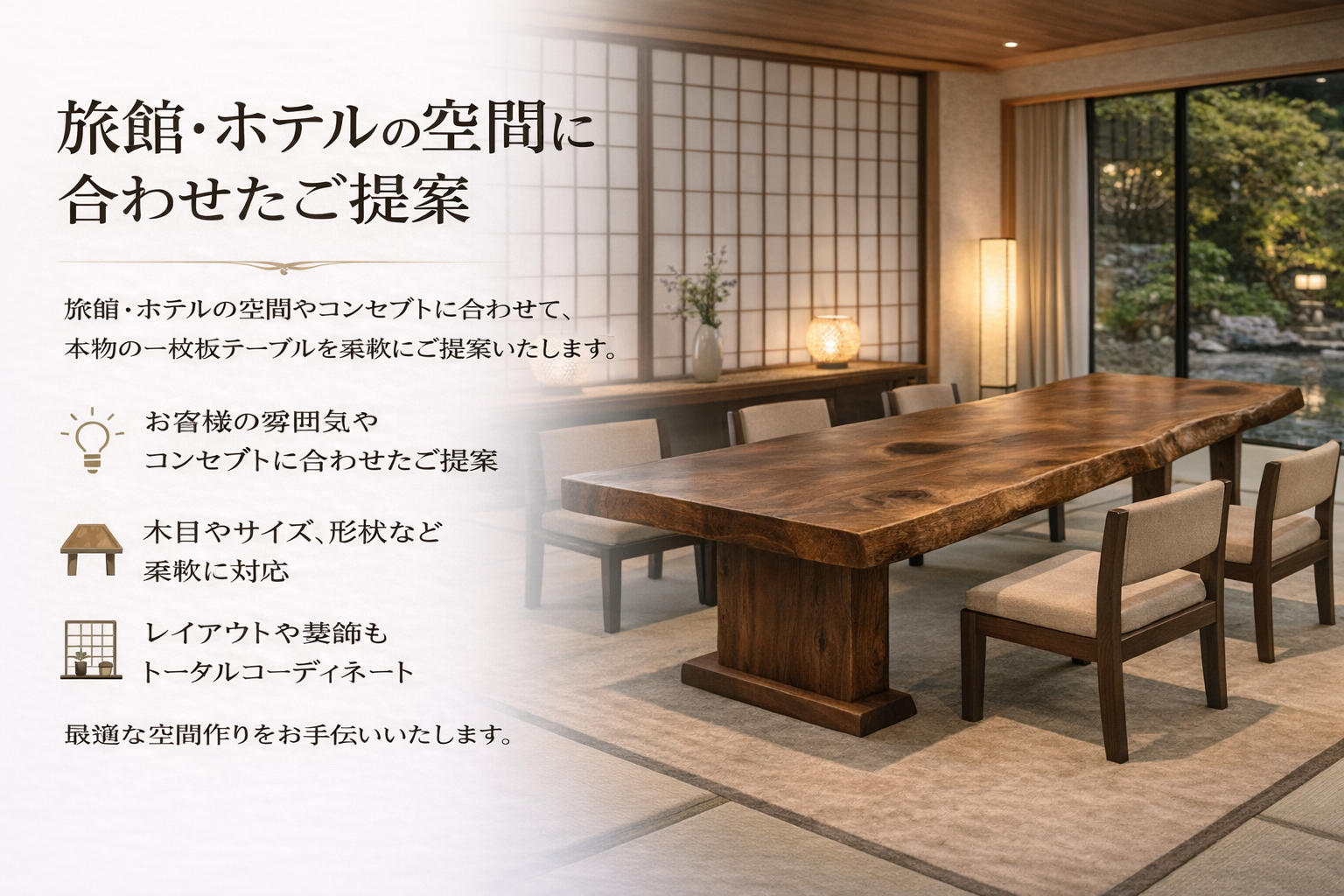国産銘木から削り出した一枚板が、空間に自然美と重厚感を演出。